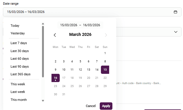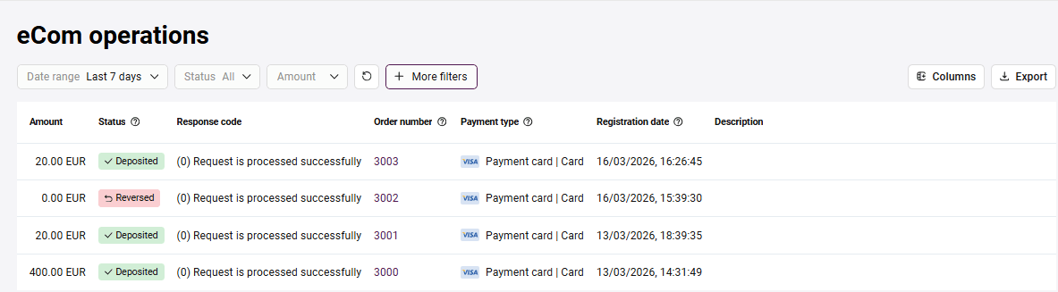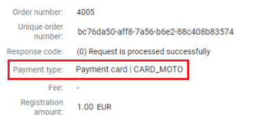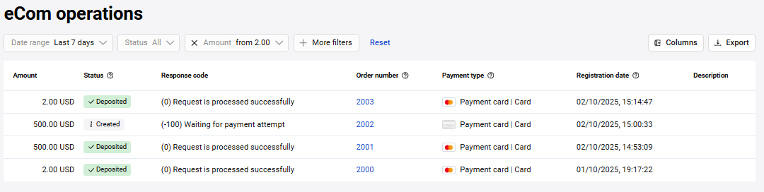 | Response code | A numeric code of a result received from a processing bank (action code). See the list of action codes here. |