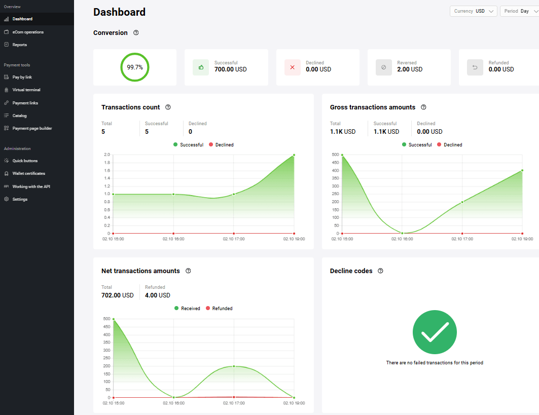 In case of a two-phase payment, the funds are first reserved on the client's account (order status is Approved) and only then are credited to the merchant's account (order status is Deposited). It is possible to configure that the final transfer takes place automatically after a certain time set in the system, e.g. after 24 hours. But this operation can be performed manually from the merchant's Personal Area.