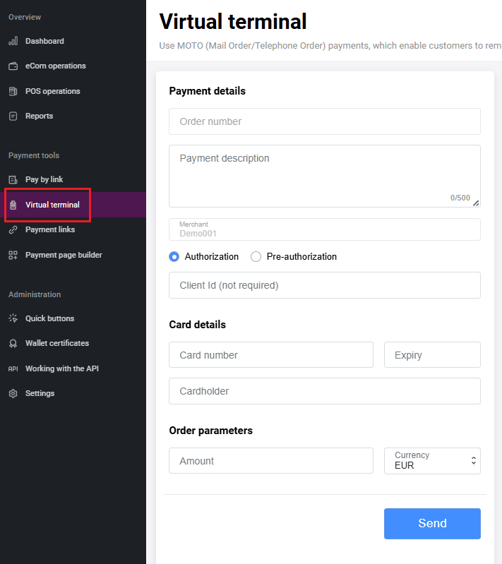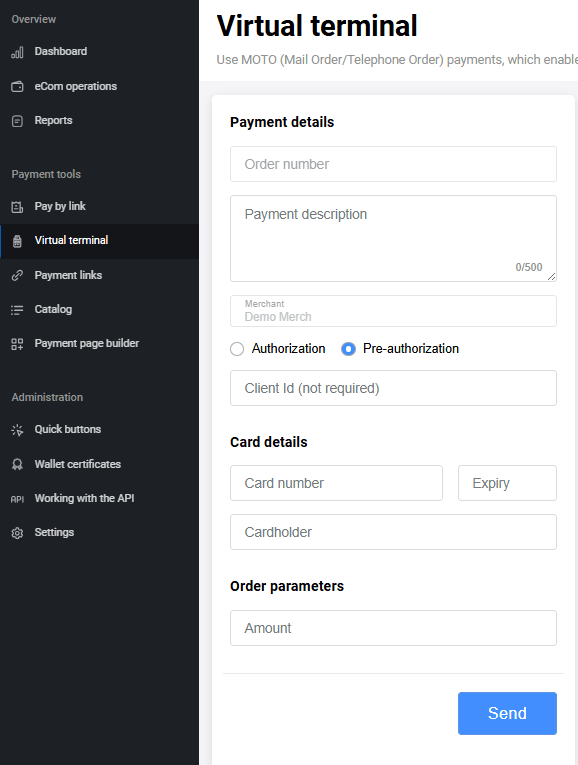 Merchants can create a payment flow as needed. For example, design own fully customized payment page. See more information about API by the link . When you create a Merchant, you receive an email with a login and a one-time password. After that you can generate API password by yourself on the Working with API page in Merchant Portal.