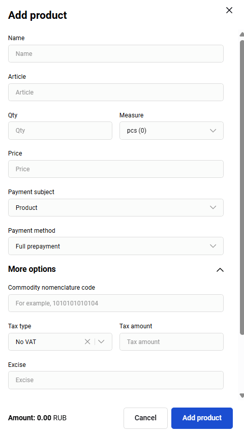 Field Description Name Product/service name. Mandatory field. Article The vendor code of the product. Mandatory field. Qty The number of units of the product. Mandatory field. Measure Units of measurement, for example: L – liters, pcs. – pieces. Mandatory field. Price Price of one product unit. Mandatory field. Amount Total amount for all units of one product item. Calculated automatically when filling in the Price and Qty fields. Click Add product.