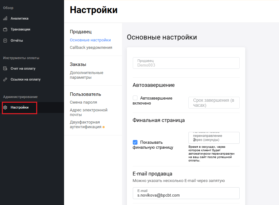| Адрес электронной почты продавца, на который будут отправляться уведомления. В это поле можно ввести несколько адресов электронной почты (через запятую). Триггеры для отправки уведомлений настраиваются. Могут быть настроены на такие события, как изменение статуса транзакции, создание связки и т.д. | |