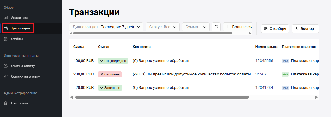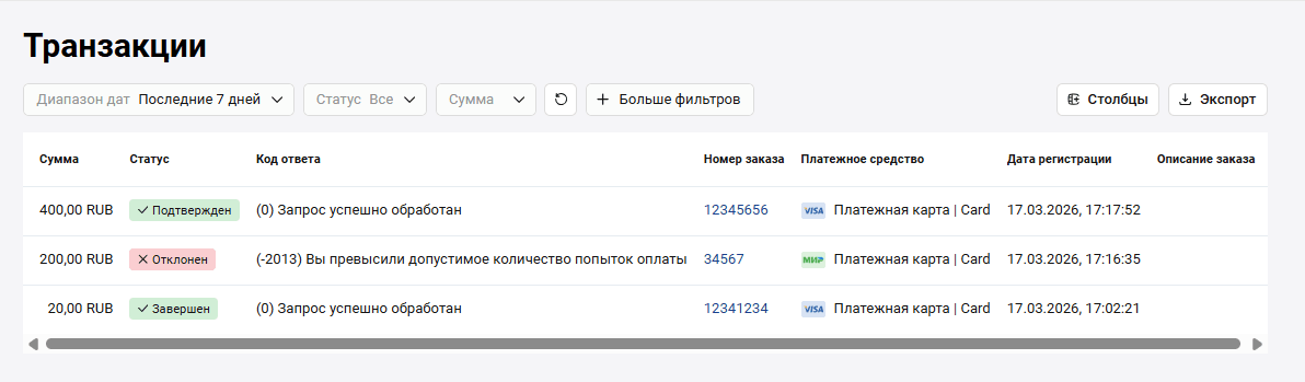 | Код ответа | Цифровой код результата, полученного от процессинга банка (action code). См. список кодов ответа здесь. |