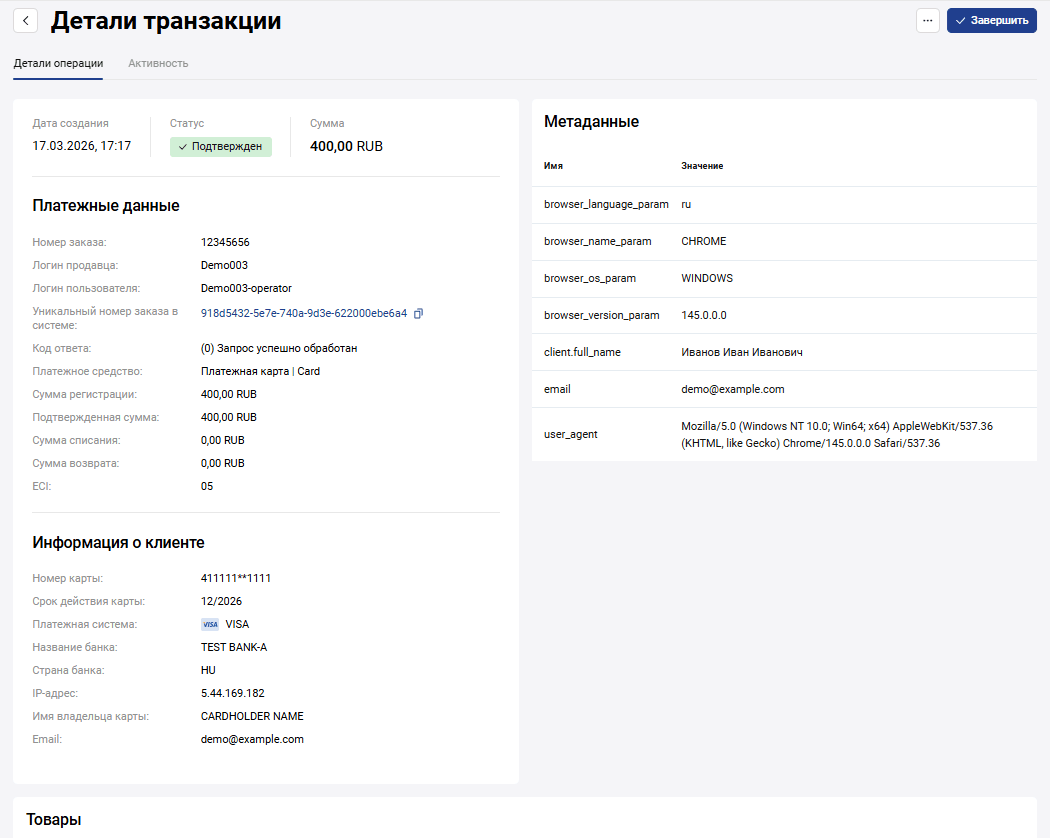 Секция Товары содержит информацию о том, какие товары или услуги оплачены в рамках транзакции.