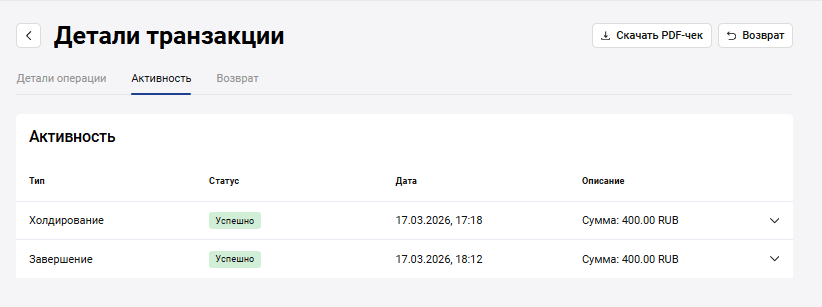 На вкладке Активность содержится информация обо всех событиях по заказу: зачислениях оплаты, возвратах и т.д.