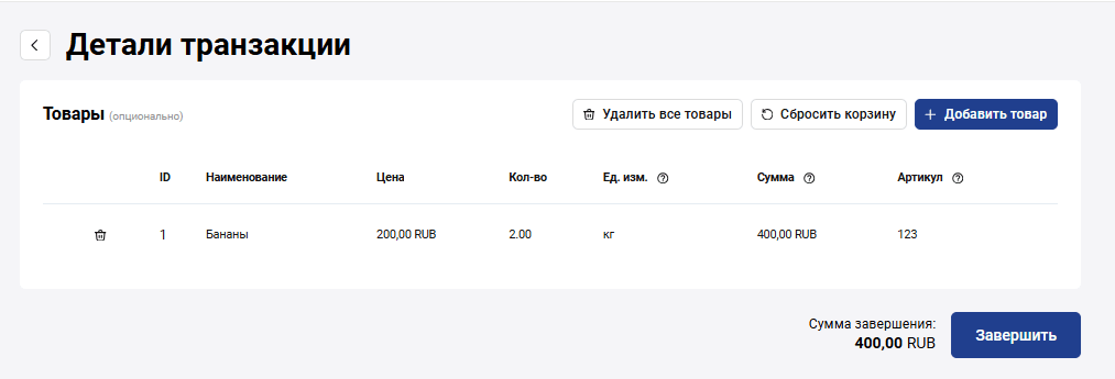 Чтобы завершить транзакцию, на странице Информация о транзакции нажмите на кнопку Завершить.